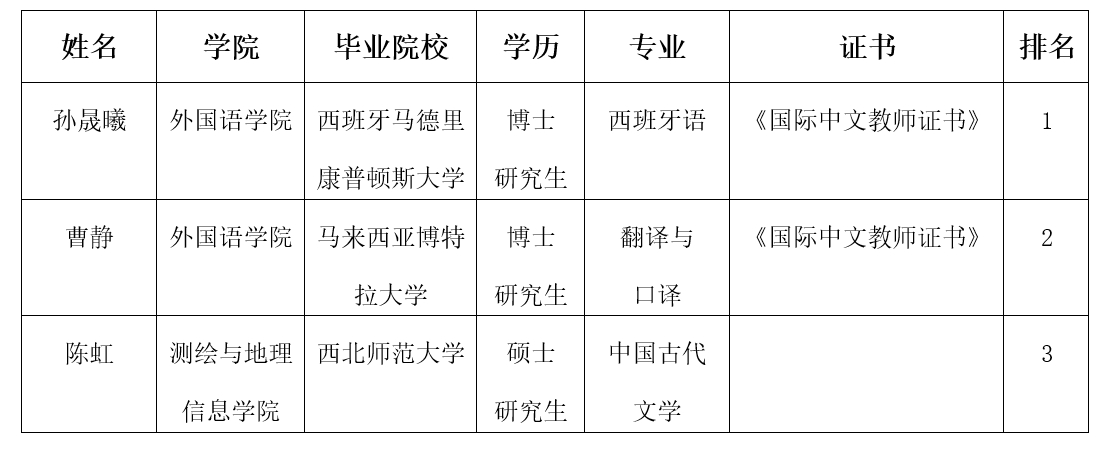 本次选拔严格按照《关于组织推荐2025年国家公派出国教师人选工作的通知》(语合〔2025〕24号)《兰州交通大学国家公派孔子学院任教教师管理办法》(兰交外发〔2024〕105 号)的要求执行,从政治素养、教学经验、专业背景、外语水平等多方面对申请人进行综合考量。经过个人申请、单位推荐、校内评审等环节,现将选拔情况予以公示: