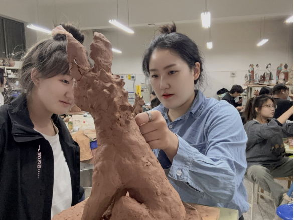 外籍教师Min Eunhye(右一)指导学生完成艺术作品