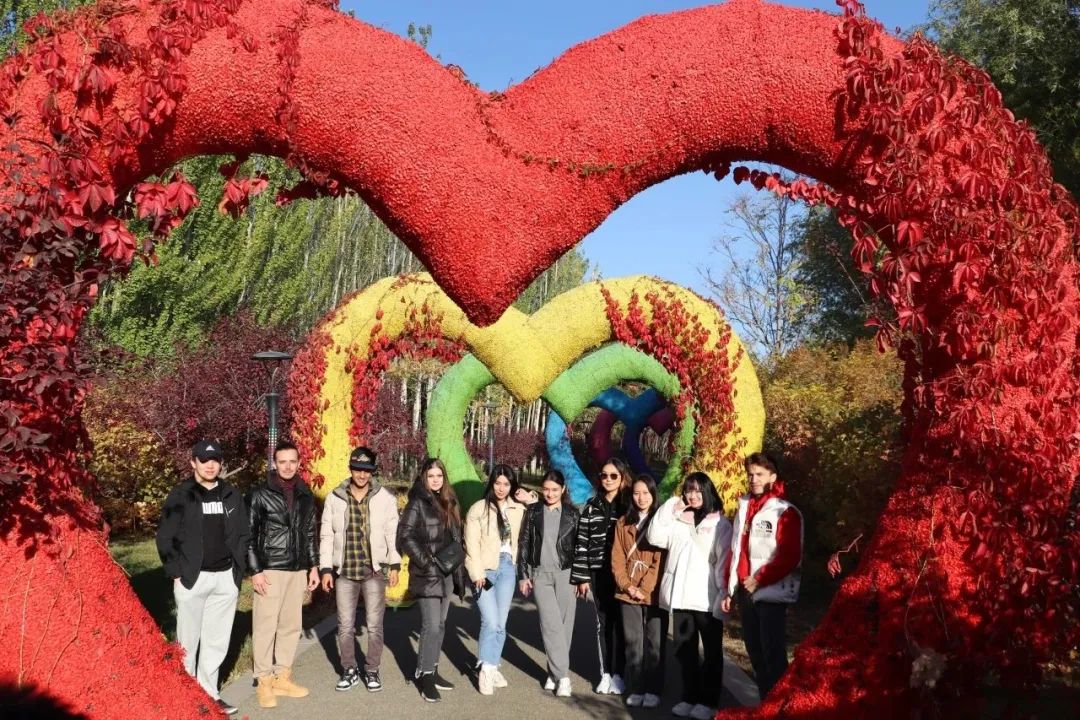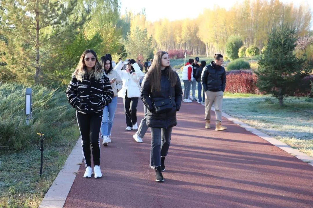 金秋时节,研学团青年留学生们漫步在张掖芦水湾旅游度假区,树木葱郁,波涛微澜,万寿菊、马鞭草、百日草等各色花卉竞相绽放,蜿蜒的步道上游客漫步休闲,湖水澄明如镜,水鸟在芦苇丛旁翩跹嬉戏,与远处巍峨的祁连群峰相映成趣,构成了一幅美丽的生态画卷。