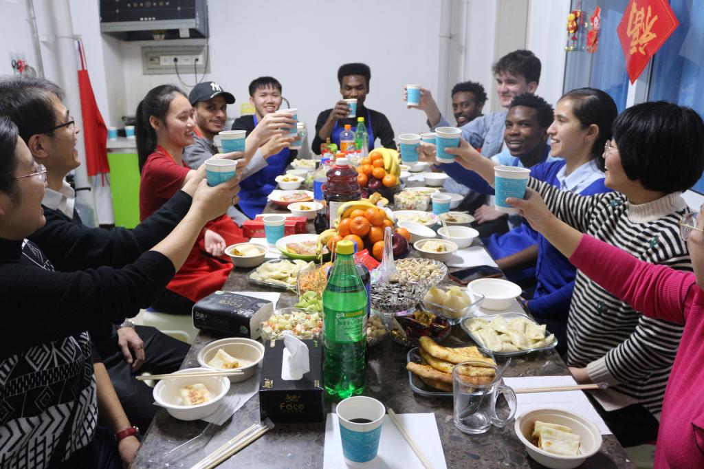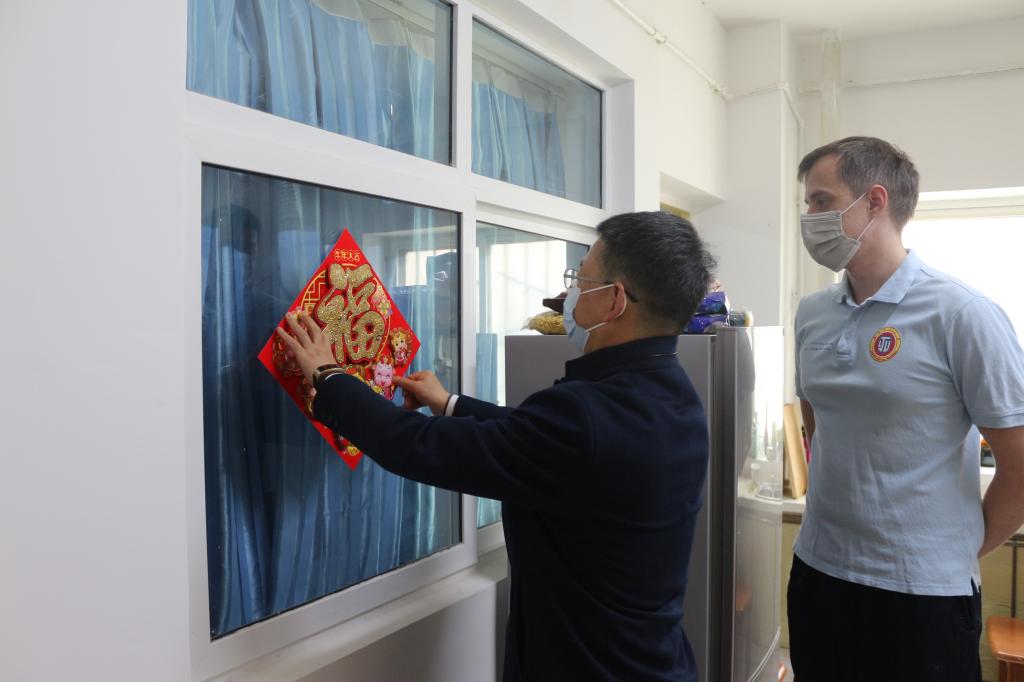 为了响应学校防控疫情工作的号召,更为了能切实保证每一位在校留学生的安全,今年学校并未组织大范围的联欢活动,而是鼓励学生按自己喜爱的方式小范围地欢庆佳节。在慰问过程中发现,学生们庆祝节日的方式多样且新颖:几位来自卢旺达的学生用中国传统的毛笔在红纸上书写“福”字;来自乌克兰的两位学生邀请校长与他们一同在宿舍贴窗花;来自也门的学生在挂着福字的房间门口跳起了家乡传统舞蹈;来自哈萨克斯坦的丹青同学为了牛年特意画了一副《金牛贺岁》;8名来自不同国家的本科一年级学生做了一桌丰盛的节日晚餐,主餐是他们亲手包的饺子。