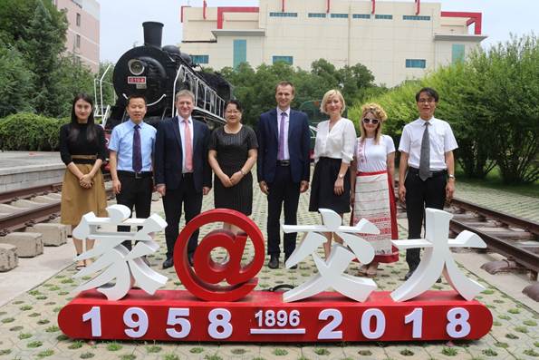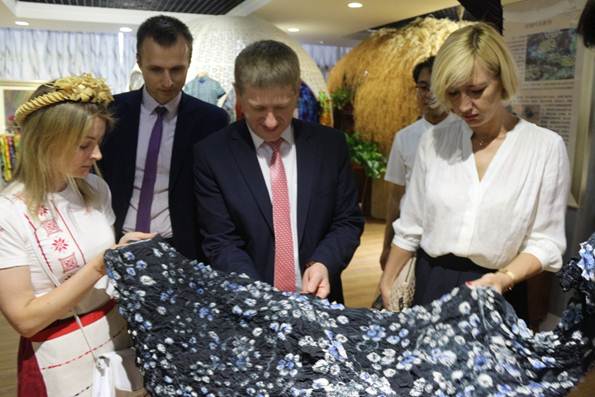 会见结束后,安德烈·斯维里多夫主席、尤里·罗曼诺夫斯基主任在国际教育学院院长张国锦的陪同下参观了我校天佑铁路主题展览馆和染缬艺术研究所。