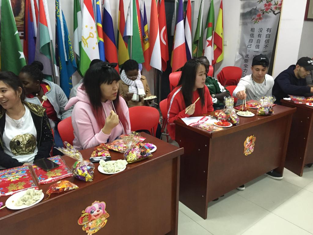 联欢会上,国际教育学院副院长姚斌代表学院向全体国际学生致以新年祝福,学院老师组织安排了丰富的联欢活动,在向学生们介绍了有关小年和春节各种习俗和文化知识的同时,还和大家做了各种游戏,并且给每位参加的同学送上了和春节主题相关的小礼物。来自土库曼斯坦、哈萨克斯坦、加纳、卢旺达、埃塞俄比亚、巴基斯坦等十几个国家的国际学生们也演出了小品、歌舞等精彩的节目。联欢会的最后,老师们更是亲自下厨,端上了一盘盘热腾腾的饺子,让留学生们真切感受到了一个颇具年味的中国节,活动在一片欢声笑语中圆满结束。