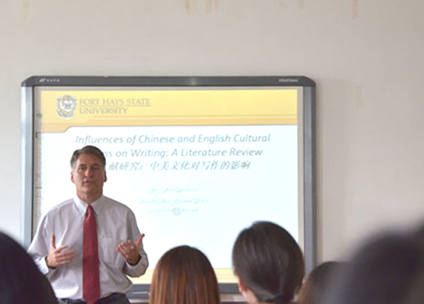 28日下午,杰拉尔德•斯保思伍德博士(Dr. Jerald W. Spotswood)在外国语学院学术厅作了题为《文献研究:中美文化对写作的影响》(Influences of Chinese and English Cultural Forms on Writing: A Literature Review)的学术报告,就“什么是文化形态,以及它们是如何影响写作的”的问题,对比分析了英汉语文化形态和修辞学差异在写作中的影响。