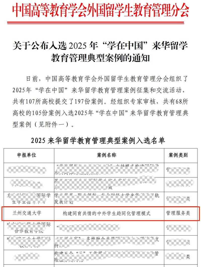 此次典型案例的入选,是对学校来华留学教育管理工作的高度肯定。未来,兰州交通大学将以此次入选为契机,进一步优化来华留学教育管理模式,为“学在中国”品牌建设贡献更多“兰交大力量”。