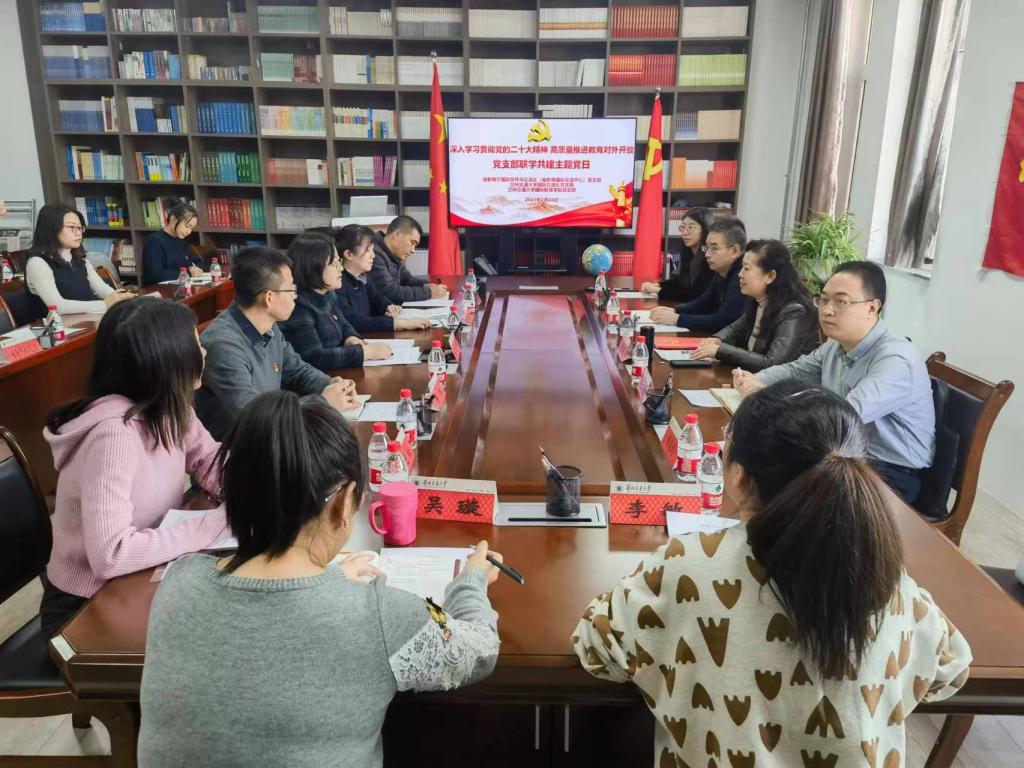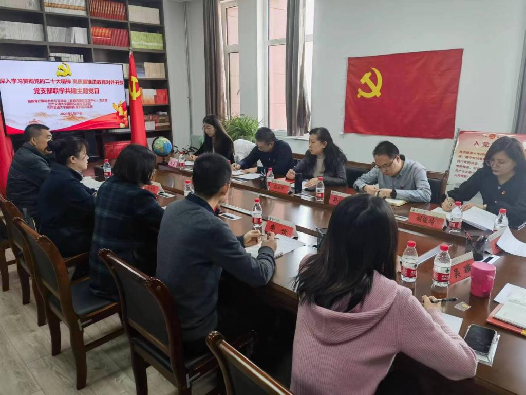 为全面落实新时代党的建设总要求,进一步增强基层党组织建设,构建资源共享、优势互补、协调发展的基层党建工作新格局,扎实推动党建与业务工作深融互促,2月24日上午,兰州交通大学国际交流处党支部和国际教育学院党支部与甘肃省教育厅国际合作与交流处党支部开展联学共建主题党日活动,并召开了以“深入学习贯彻党的二十大精神,高质量推进教育对外开放”为主题的座谈会。