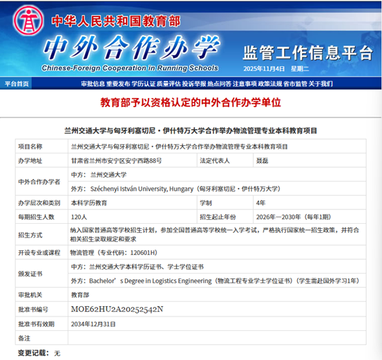 兰州交通大学与匈牙利塞切尼·伊什特万大学合作举办物流管理专业本科教育项目为我校首个中外合作办学项目。该项目设置在物流管理专业,标准学制为四年,采用“3+1”培养模式,双方均为该项目学生注册学籍。项目学生在我校完成前三年学习,英语水平达到B2以上或符合外方录取国际学生语言成绩要求,第四年赴外方完成此项目最后一年的学习。如学生修完双方互认学分后的其余相关课程学分且符合外方颁授学位条件,外方为学生颁发外方的学士学位证书,同时,我校为其颁发相应的学历和学位证书。该项目预计于2026年9月开始招生。